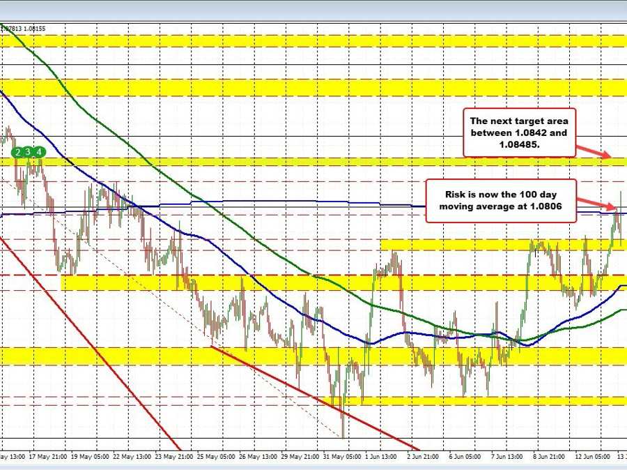 EURUSD: The EURUSD which stalled just ahead of the 38.2% retracement of the move down from the April 26 high at 1.08108 earlier today, has now broken through that level and currently trades at 1.0820. The 100-day moving average is also in play at 1.0806 and was broken. The next target area comes between 1.0842 and 1.08485. Risk is now the 100-day moving average 1.0806. Stay above is more bullish.