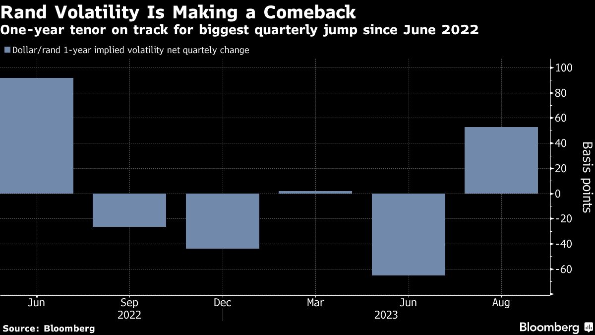 The rand’s one-year implied volatility — the options market’s estimates of price swings over the life of the contract — has shot up from three-year lows reached last month.