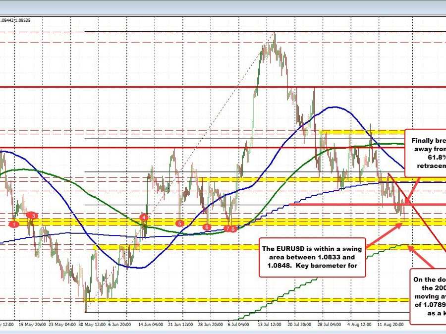 - EURUSD: The EURUSD is training to the lowest level since July 6 and in the has moved into a swing area between 1.0833 and 1.08485. That area is a key barometer for both buyers and sellers today. A move below would have traders targeting the 200 day moving average. On the top side the prices moving away from its 61.8% retracement level at 1.0880.